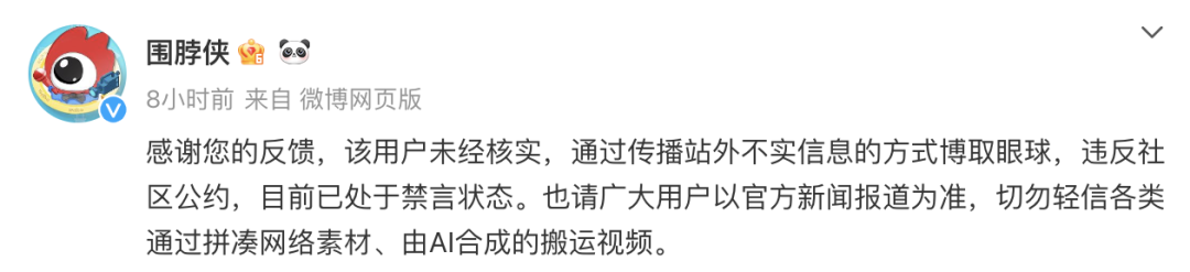 5月4日,微博社区观察员官方账号@围脖侠 对上述消息进行辟谣并对造谣用户禁言:该用户未经核实,通过传播站外不实信息的方式博取眼球,违反社区公约,目前已处于禁言状态。也请广大用户以官方新闻报道为准,切勿轻信各类通过拼凑网络素材、由AI合成的搬运视频。