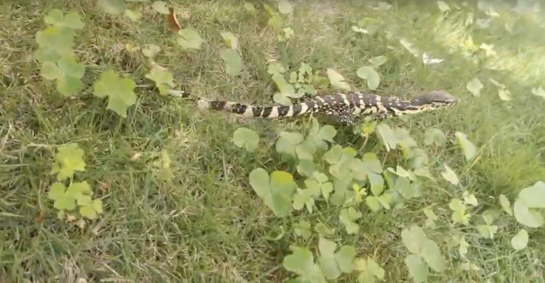 科研人员在跟踪拍摄过程中,圆鼻巨蜥感受到了威胁,随即摆出防守姿态,不断地吐舌头。经工作人员观察,此圆鼻巨蜥无受伤迹象,进食正常,可以直接让其回归大自然。