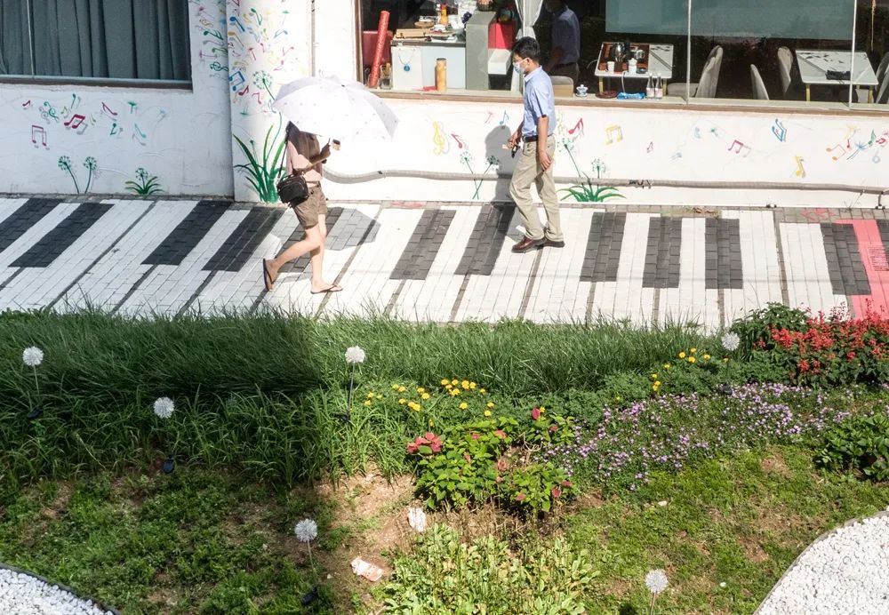在大尧三路转角处,市民游客穿行其中,脚下是黑白交错的“钢琴键”地画,周围是数种鲜花和乔灌木相互簇拥,耳畔不时还能听到悦耳的琴声……这座以音乐为主题的口袋公园,让市民宛若在画中游走。