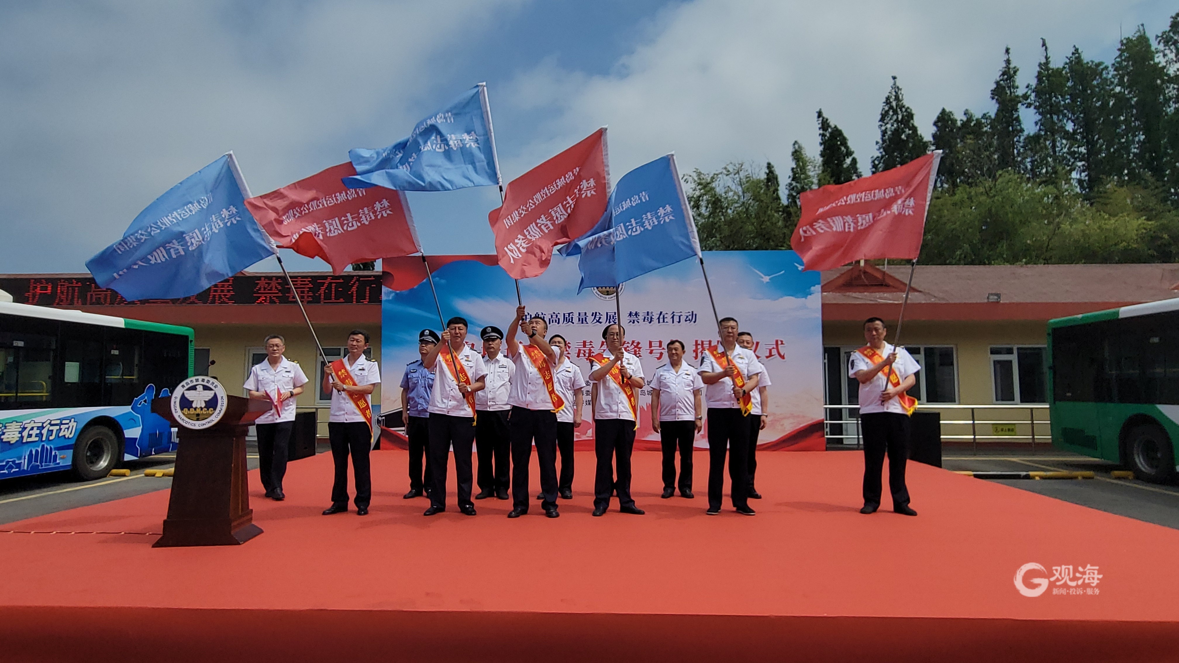 青岛日报社/观海新闻6月15日讯 6月15日上午,在位于武昌路5号的青岛城运控股公交集团隧道巴士第六分公司,由青岛市禁毒委员会办公室、市南区禁毒委员会办公室、青岛城运控股集团联合开展的“禁毒先锋号”揭牌仪式启动。活动现场,公交6路线被授予“禁毒先锋号”,10辆“禁毒主题宣传车”成为一道靓丽风景线。公交集团6支团队被授予“禁毒志愿服务队”旗帜。