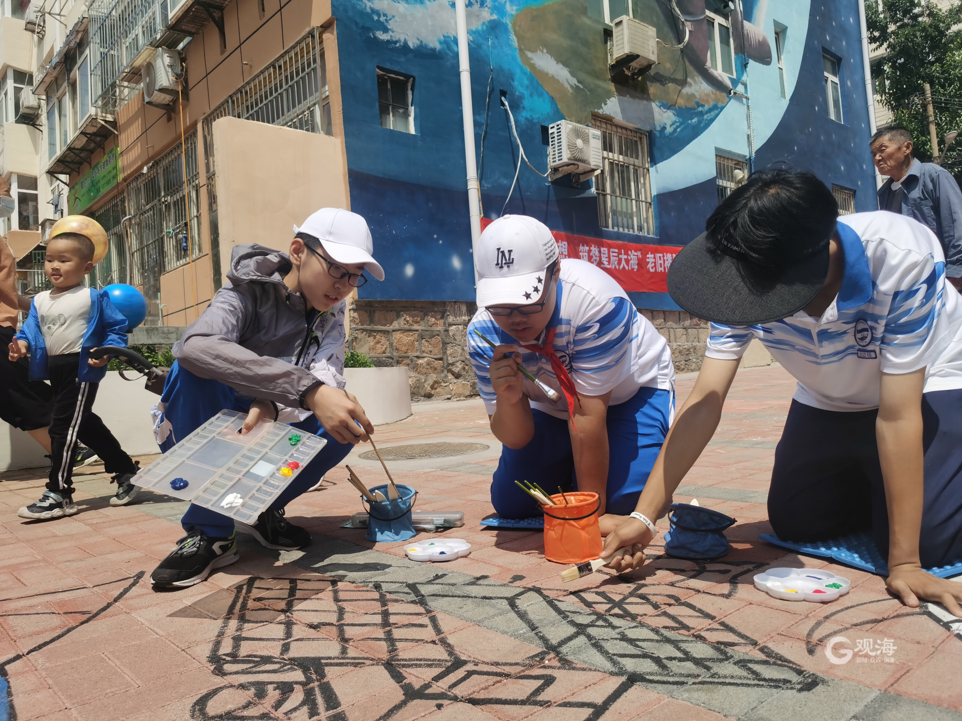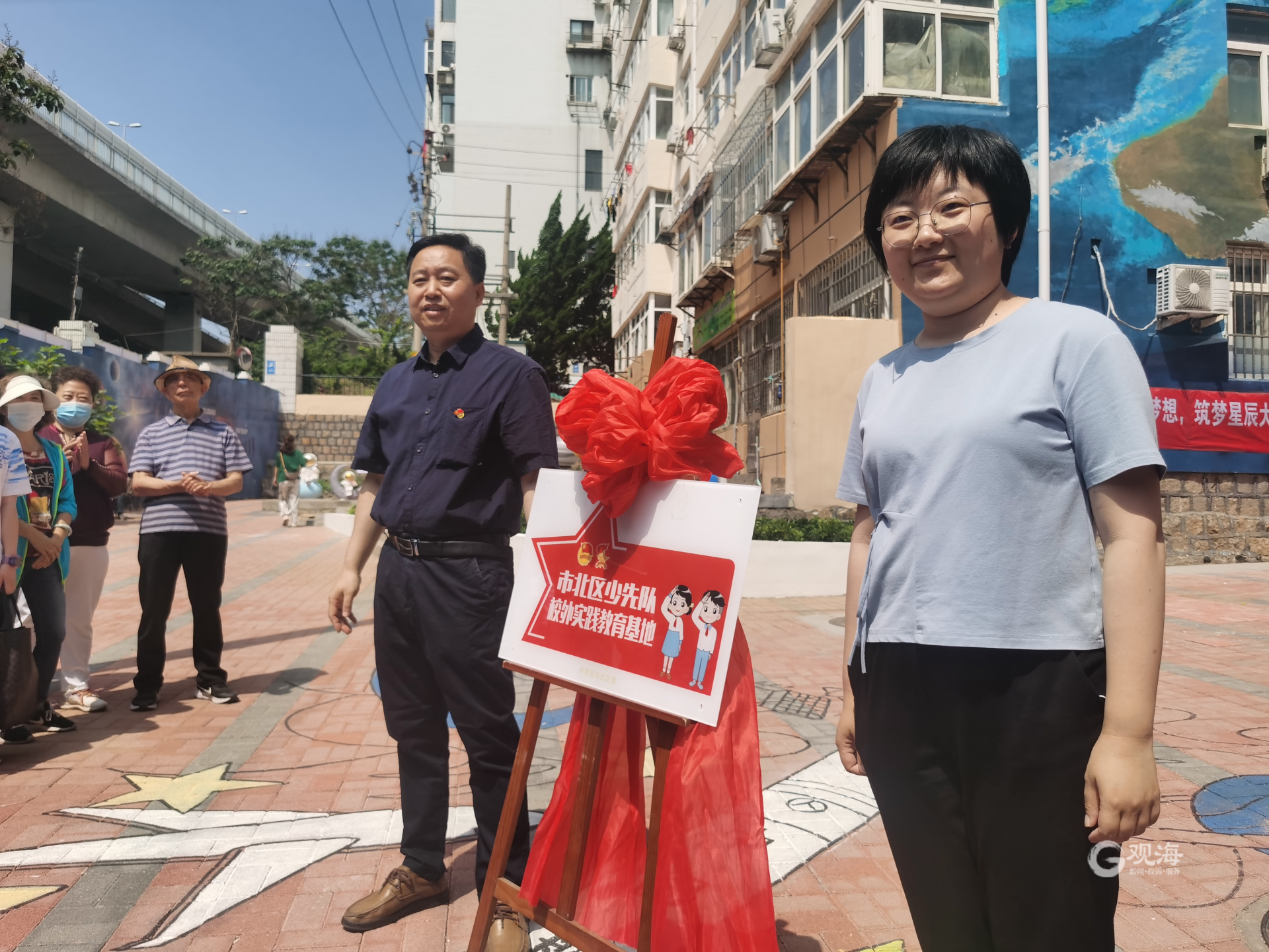 活动现场,辽宁路街道党工委副书记田义召、共青团市北区委副书记苏婧劼共同为“市北区少先队校外实践教育基地”揭牌。两位“小小科普讲解员”带领20多位来自青岛大学附属中学的同学们参观了自己的设计成果,了解了宇宙的诞生、先祖的探索、寻梦太阳系等科普知识。参观结束后,同学们拿起画笔,共同参与楼院彩绘图案的绘制,气氛热烈活跃。
