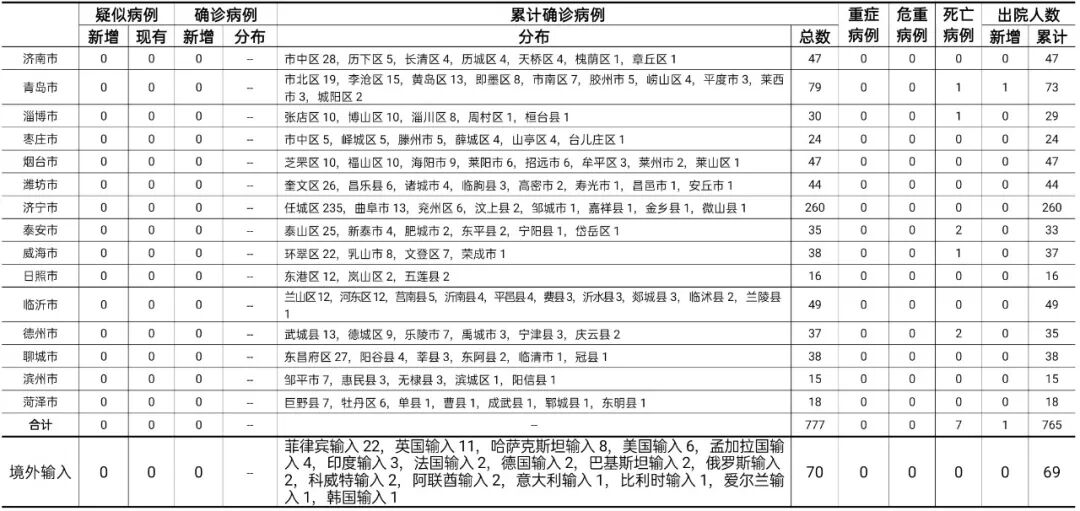 山东无新增本地疑似病例、确诊病例。累计报告确诊病例777例,死亡7例。新增治愈出院病例1例,累计治愈出院765例。