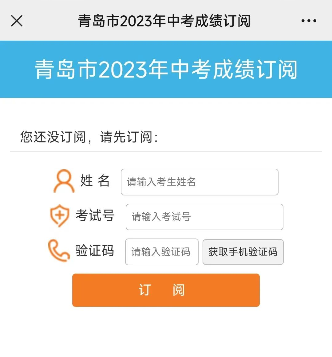点击底部的“成绩订阅”,进入订阅页面,在页面中输入考生的姓名、考试号,然后点击“获取手机验证码”,系统会给相应的手机号(网上志愿填报时,在“联系手机”栏输入的号码)发送验证码,输入短信验证码后完成订阅。