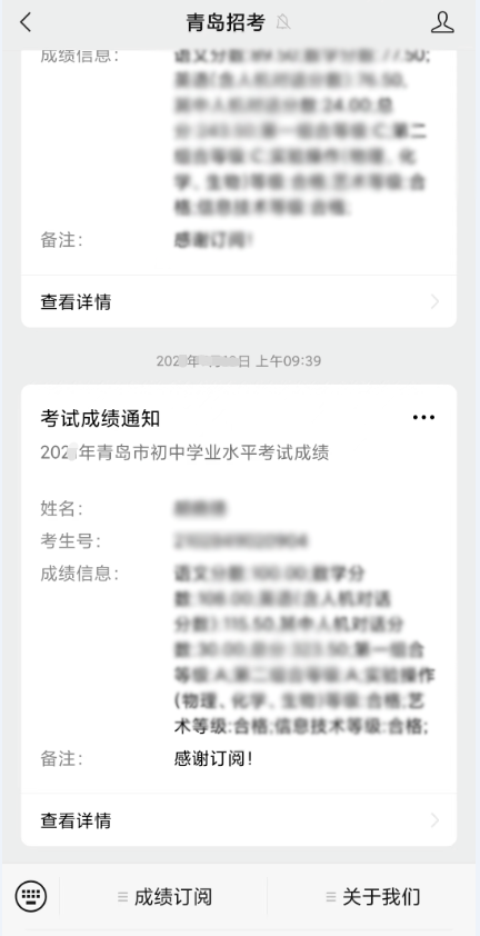 为方便考生第一时间获取青岛市初中学业水平考试成绩,避免网络拥堵,青岛市教育局推荐考生使用青岛市初中学业水平考试成绩微信免费订阅服务。