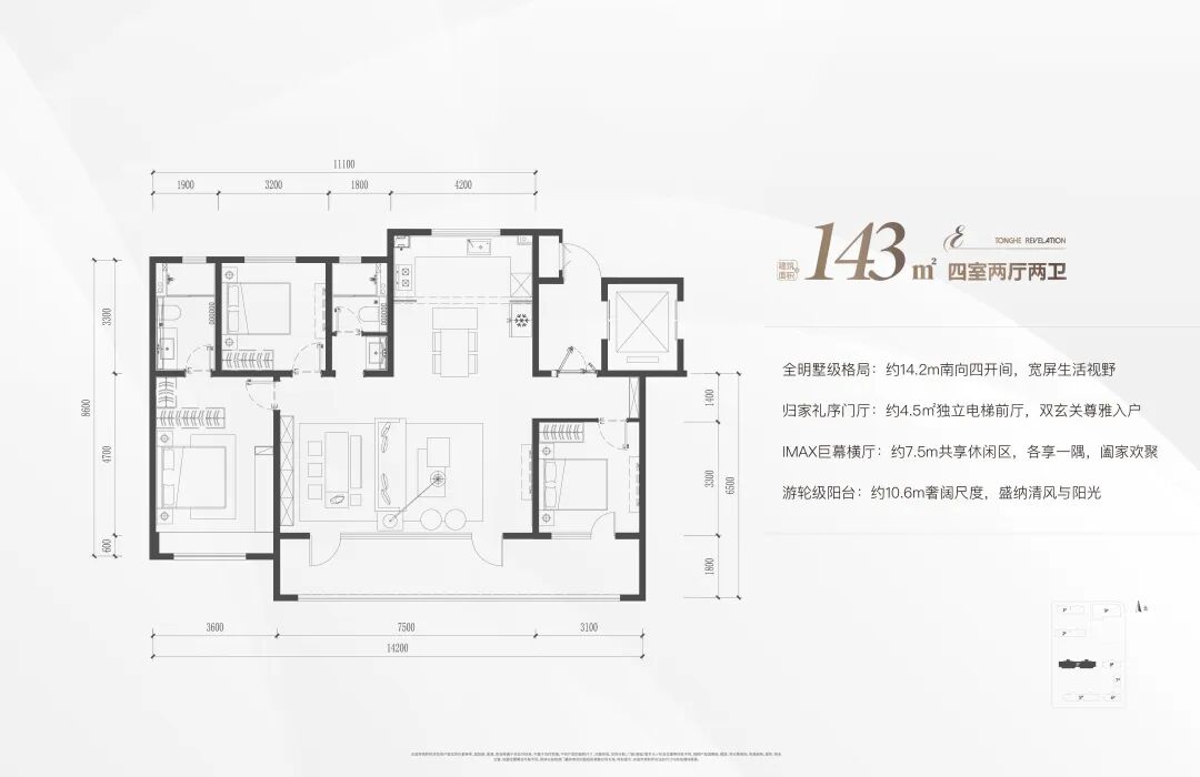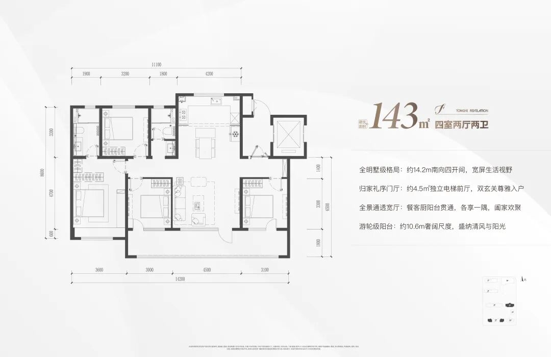 面宽,一直作为居住舒适性的重要指标成为建筑的外在表情,决定着居住者的视野和气度。以建面约143㎡的洋房户型为例,大手笔规划约14.2米南向四开间,搭配约10.6米的游轮级三联阳台,优越的窗墙比,做到采光与景观视界的更大化,诠释真正大宅空间尺度。