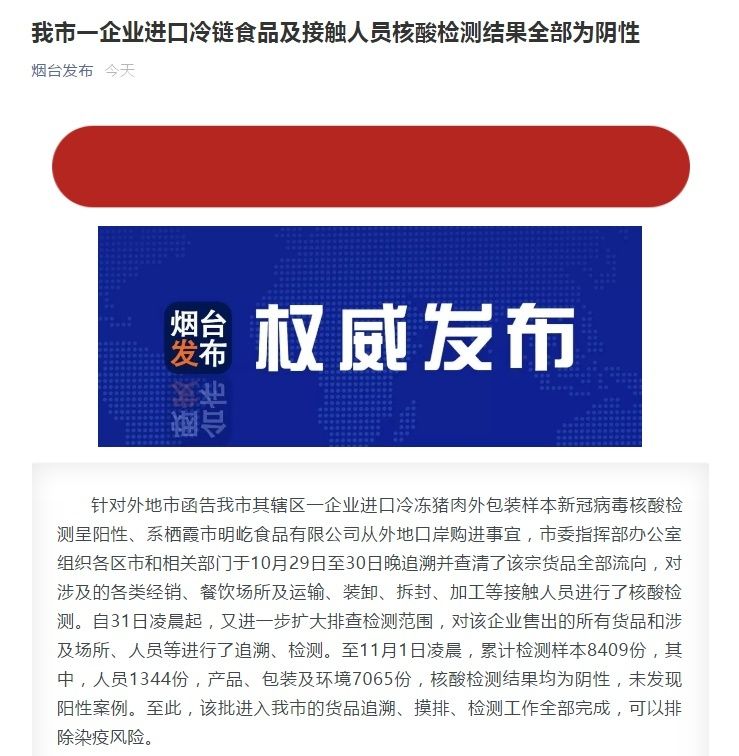 针对外地市函告我市其辖区一企业进口冷冻猪肉外包装样本新冠病毒核酸检测呈阳性、系栖霞市明屹食品有限公司从外地口岸购进事宜,市委指挥部办公室组织各区市和相关部门于10月29日至30日晚追溯并查清了该宗货品全部流向,对涉及的各类经销、餐饮场所及运输、装卸、拆封、加工等接触人员进行了核酸检测。自31日凌晨起,又进一步扩大排查检测范围,对该企业售出的所有货品和涉及场所、人员等进行了追溯、检测。至11月1日凌晨,累计检测样本8409份,其中,人员1344份,产品、包装及环境7065份,核酸检测结果均为阴性,未发现阳性案例。至此,该批进入我市的货品追溯、摸排、检测工作全部完成,可以排除染疫风险。