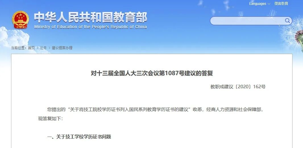 日前,针对人大代表提出的“关于将技工院校学历证书列入国民系列教育学历证书的建议”,教育部在其官网予以答复。