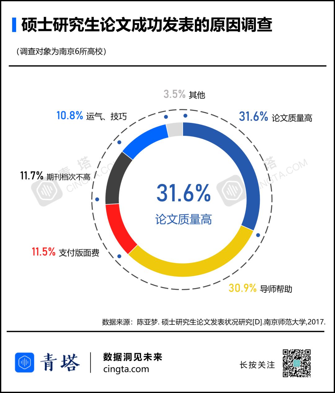 比如浙江某高校曾明确要求,除了本身的学位论文,硕士生在学期间至少应公开发表一份与本学科、专业相关的科研成果;广东某高校则要求博士生在校期间要达到“四个至少”:至少有一篇英文论文发表、至少一篇论文被三大索引收录、至少一篇论文署名第一作者、至少一篇论文以该校在校博士生身份。但是科研工作本身就带有很大的不确定性,想要在前人所未至的地方取得突破,三年或四年的时间,就显得捉襟见肘。当被问及成功发表学术论文的原因,有底气归因于自身论文质量高的研究生占比仅在三成左右。