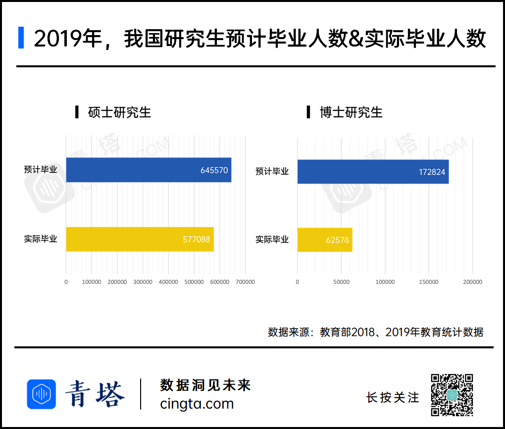2019年,我国预计毕业硕士生人数为645570人,实际毕业人数为577088人;博士研究生预计毕业人数为172824人,实际毕业人数仅为62578人。这中间,又有着多少失意的延毕学子呢?