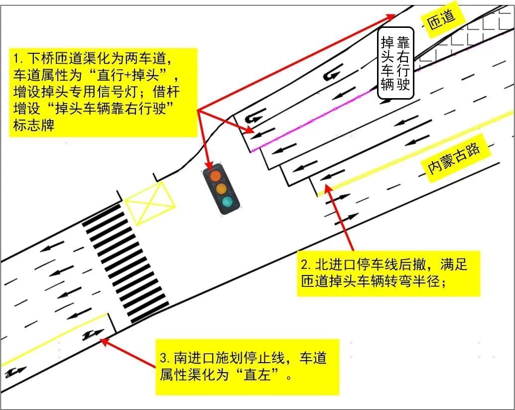 1.内蒙古路北进口停止线后移20米,下桥匝道渠化为两车道(长度50米以上,保证掉头车辆蓄车空间),车道属性为“直行+掉头”,内侧车道停止线呈阶梯状,满足匝道掉头车辆转弯半径;2.增设掉头专用信号灯,对掉头车辆实施信号控制;匝道进口借杆增设“掉头车辆靠右行驶”标志牌;3.内蒙古路南进口施划停止线,车道属性渠化为“直左”。