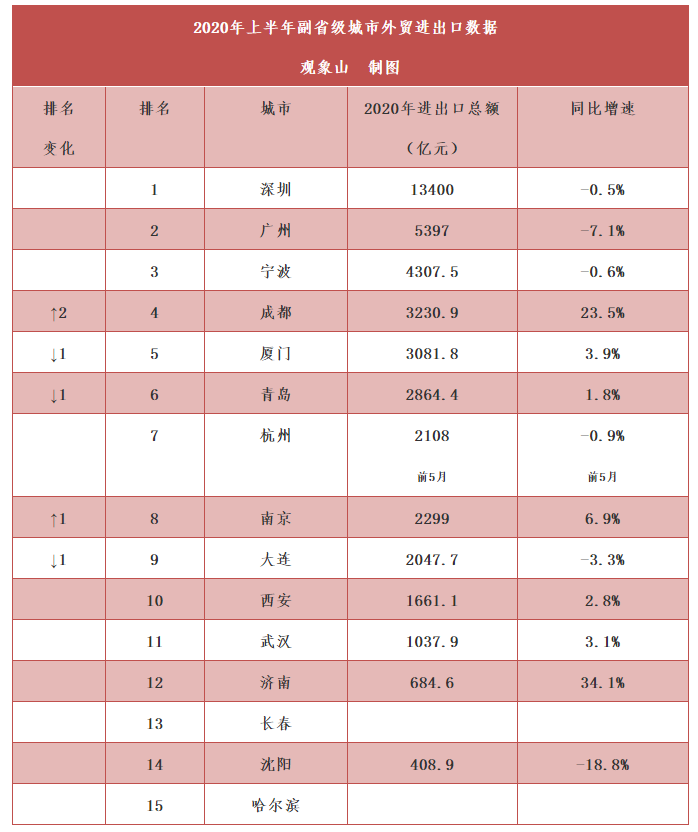 观象君试图以副省级城市为坐标系,通过对全国15个副省级城市上半年外贸数据的解析,寻找隐藏在数据背后的“外贸密码”。