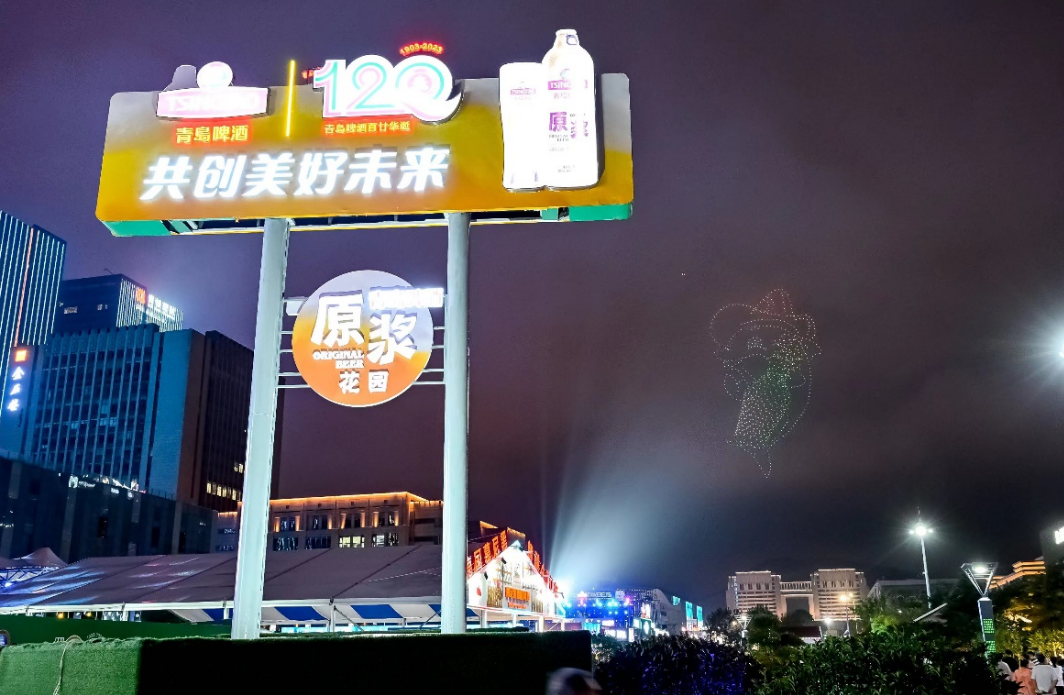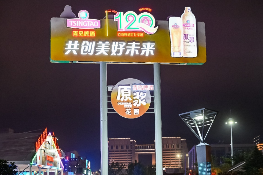 今年是青岛啤酒120周年华诞,无论是金沙滩啤酒城还是崂山会场,青岛啤酒布置均以120周年元素为主,在青啤原浆花园入口处可见“感恩百廿同行 共创美好未来”和青岛啤酒120周年标识,用百廿元素扮靓青岛啤酒节。青啤120周年标识采用红、绿、金三色,由数字“120”、“1903-2023”和青岛栈桥回澜阁图标,麦穗、波纹等造型组成,代表着青岛啤酒120年的里程碑与新起点。
