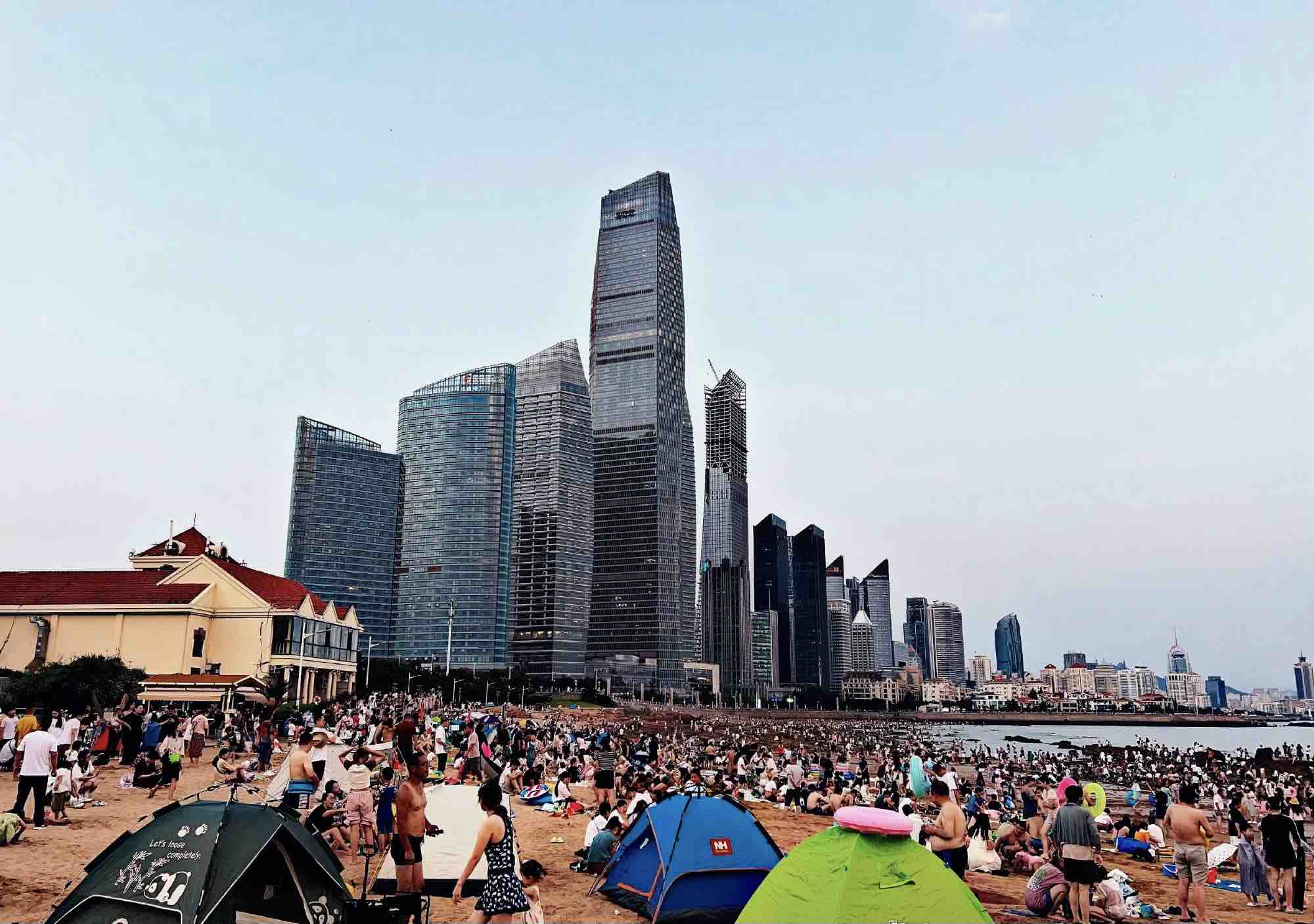 青岛的沙滩在夏季从来都是满布游客的身影,除了“老牌网红”一浴、石老人海水浴场等,三浴仿佛是一股新生力量,在今年逐渐爬上榜首,人气爆棚,成为“青岛夜景天花板”“灯光秀最佳观看点”。三浴的面积相比其他浴场较小,但海水非常清澈,平坦的海滩和礁石浪花拼凑出海滨特有的美景。从地理位置上看,三浴离五四广场很近,从这里望向那些鳞次栉比的高楼,视野开阔、没有遮挡,十分适合观看浮山湾灯光秀。白天,沙滩、海风和阳光的完美结合,让游客感受青岛的自然美景;晚上,大海为前景,灯光秀逐渐亮起,给绝佳的视野更添一份摩登浪漫。