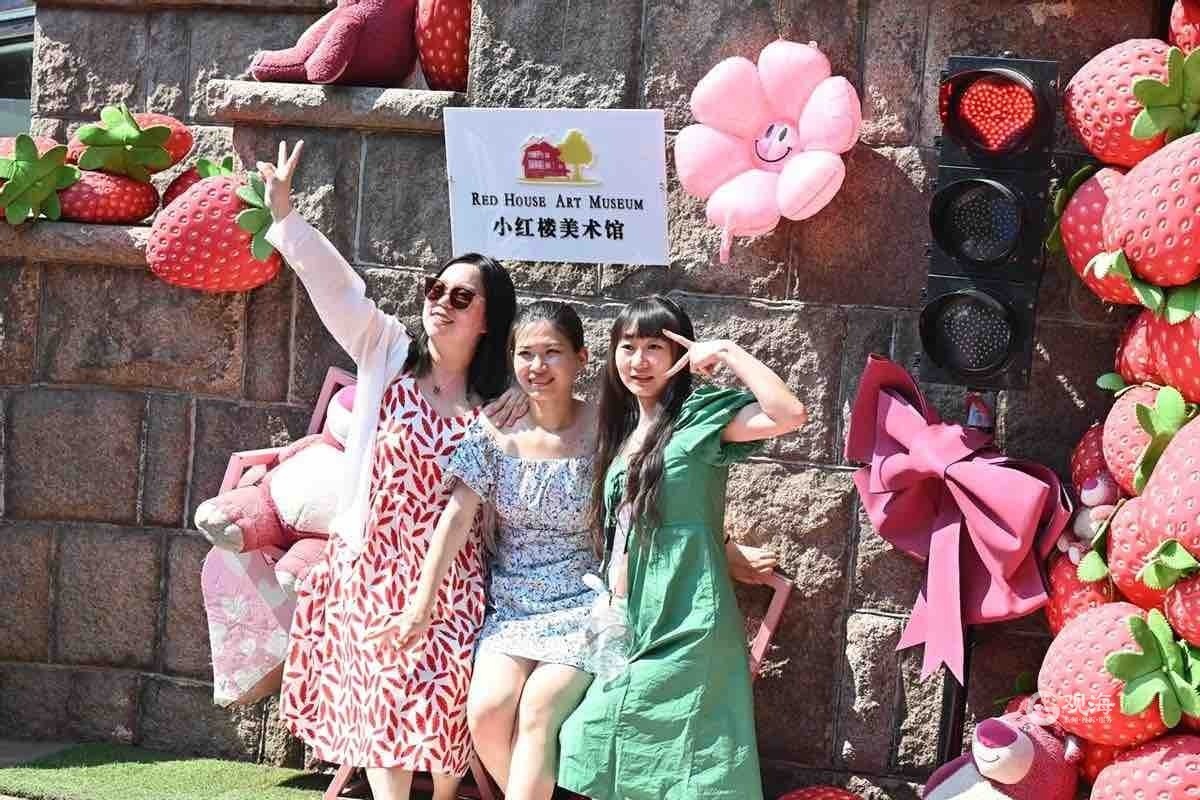 “你永远可以相信小红楼的浪漫……”就如同墙上的这句标语,走在文艺气息十足的安徽路上,一栋精致典雅的红色老洋房总能在第一时间吸引你的视线。这座位于安徽路16号的小红楼建于1913年,早期一直作为私人府邸,如今,它以小红楼美术馆之名重回人们的视线。三层砖木结构、红瓦坡顶、德式复古门窗,以及庭院内的百年银杏树,修葺过后的小红楼古典气息被完整保留下来。如今,这里成为集美术、书房、咖啡馆和艺术交流于一身的文艺休闲场所。小红楼美术馆运营者将年轻人喜欢的流行歌词、浪漫风路牌“上墙”“入院”,地面也粉刷成有设计感的图案,吸引众多市民游客打卡,并借助短视频平台火速出圈,成为网友口中的“宝藏美术馆”。“小红楼美术馆内有许多精心设计的展览区域,每个角落都是一个绝佳的拍照背景,随便一拍都很出片,而且这里的展览会经常更新,很让人期待。”在外地上学的大二学生辛羽告诉记者,自己每个假期都会来打卡,每一次都有新的惊喜。