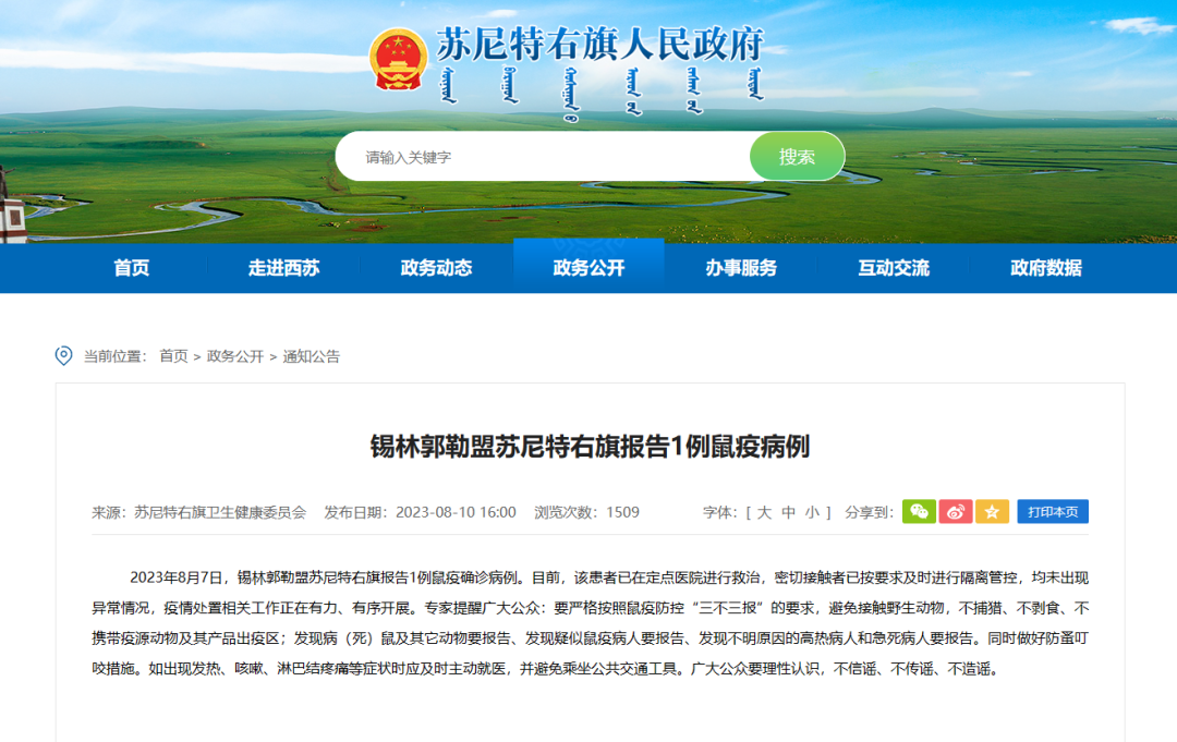 此前,8月7日,锡林郭勒盟苏尼特右旗报告1例鼠疫确诊病例。目前,该患者已在定点医院进行救治,密切接触者已按要求及时进行隔离管控,均未出现异常情况,疫情处置相关工作正在有力、有序开展。