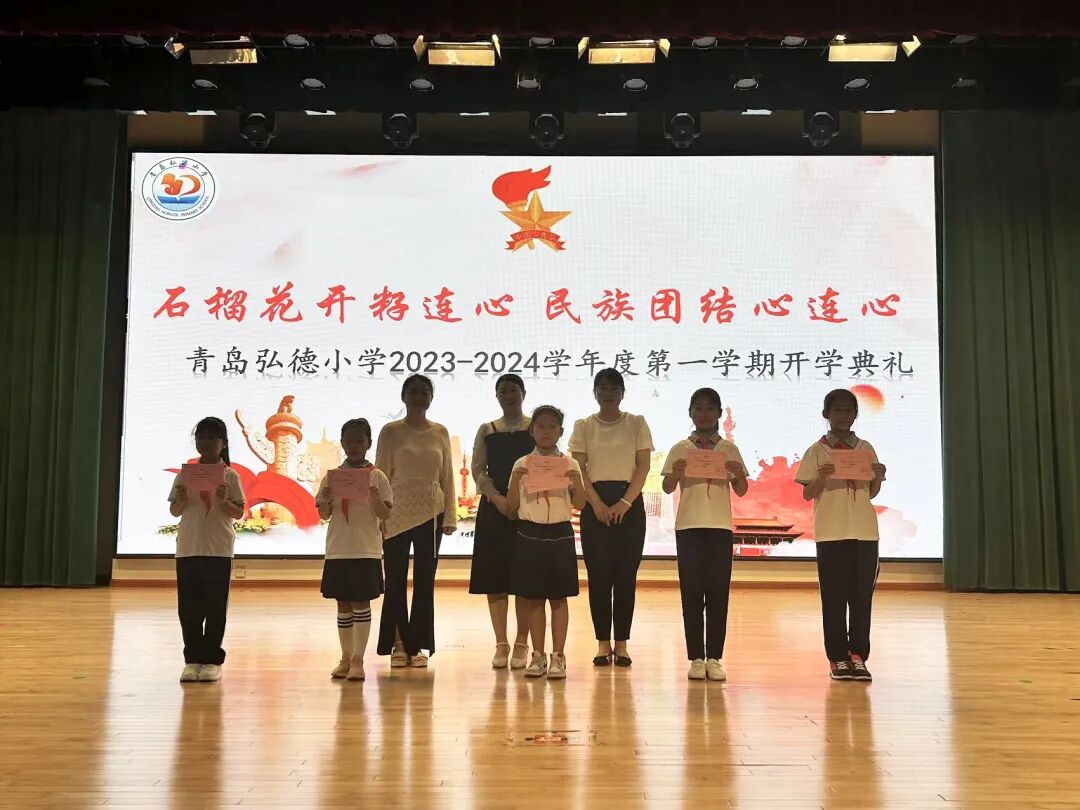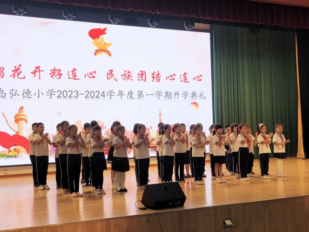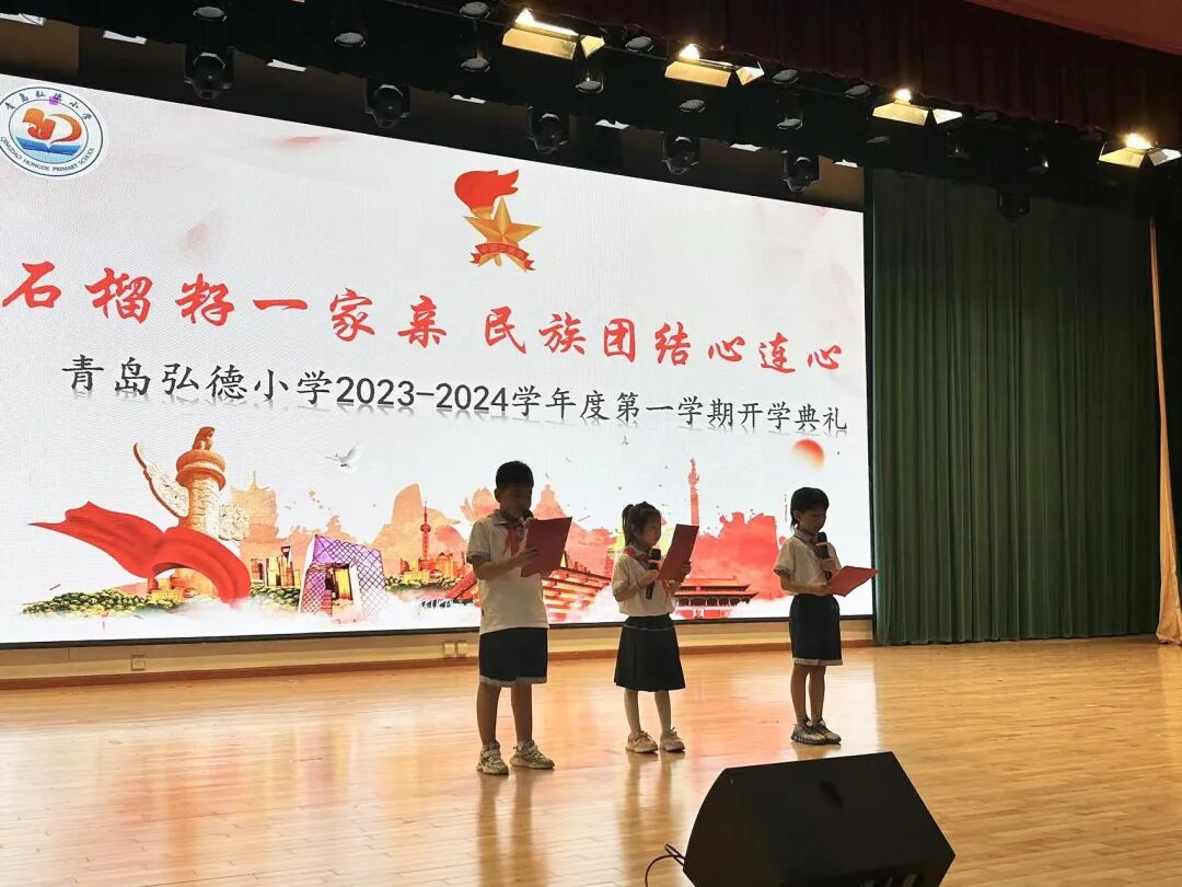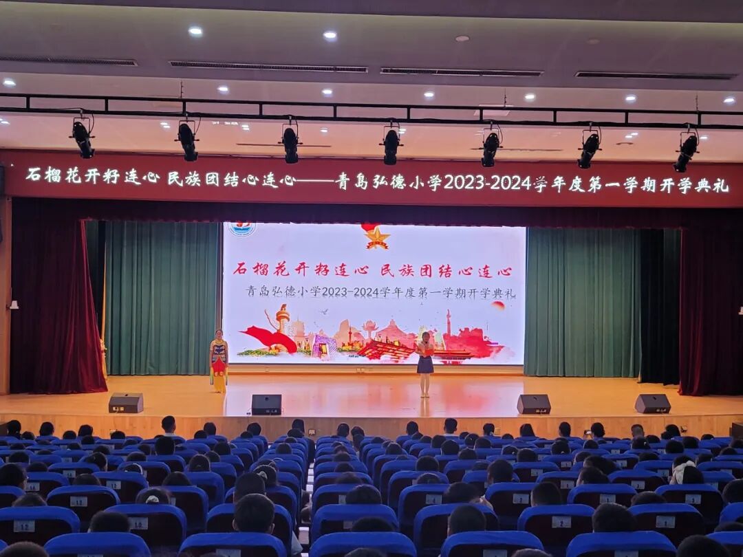 告别了骄阳似火的夏日,清凉宜人的秋天向我们展开了笑颜;告别了安静沉寂的假期,我们的校园又充满了欢声笑语;迈着轻盈的步伐,沐浴八月的阳光,收获金秋的希望。2023年8月28日上午,青岛弘德小学隆重举行了2023-2024学年度第一学期“石榴花开籽同心 民族团结心连心”开学典礼活动,全体师生共迎新起点,携手新征程。