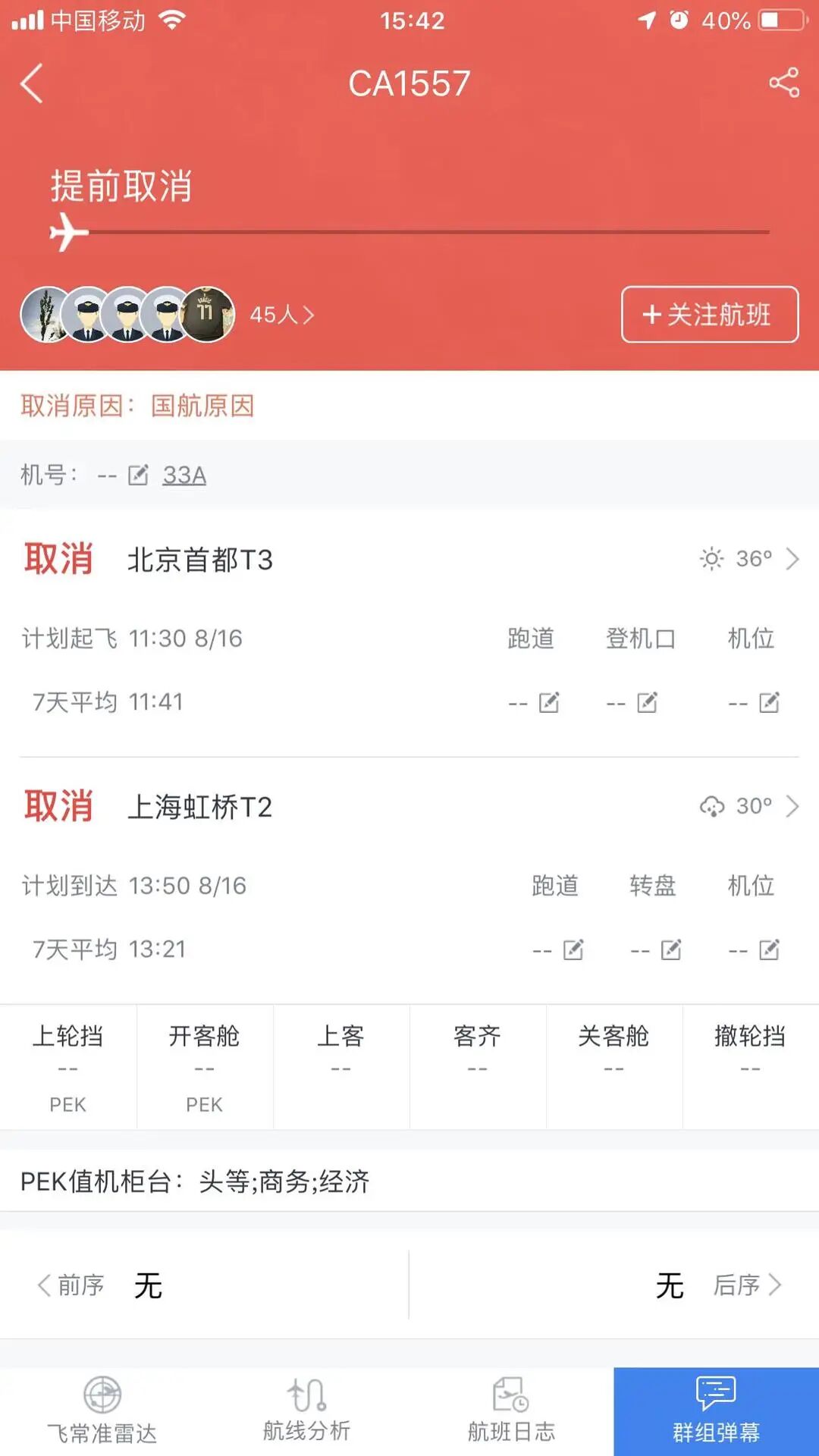 航旅纵横APP显示,该航班原计划8月16日11:30分从北京首都机场T3起飞,13:50分抵达上海虹桥机场,但16日该航班已取消。