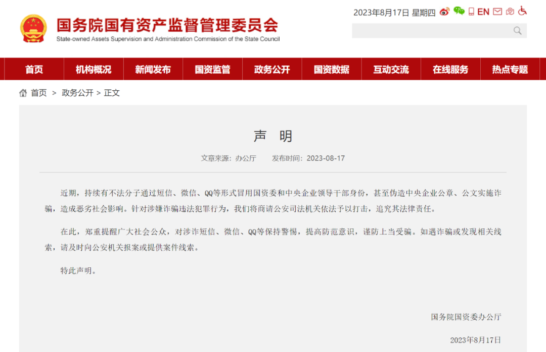 8月17日,国务院国有资产监督管理委员会网站发布声明,全文如下: