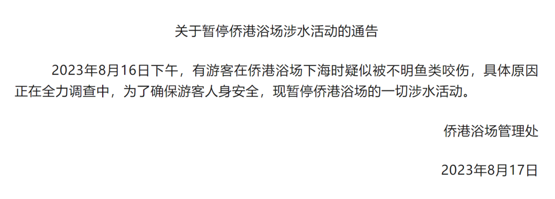 17日,广西北海侨港浴场管理处发布通告:16日下午,有游客在侨港浴场下海时疑似被不明鱼类咬伤,具体原因正在全力调查中,为了确保游客人身安全,现暂停侨港浴场的一切涉水活动。
