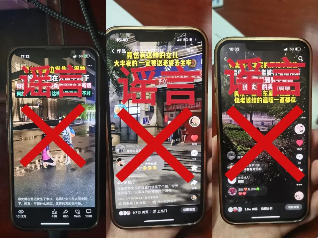 经核实,该视频信息为谣言,系由网民周某某、杨某某、李某某三人策划拍摄的虚构事实。自2023年4月起,三人为吸引流量、赚取经济利益,在多个平台上发布“雨天街面母亲脚踢倒地女儿”“摩的司机为争抢客人当街拉扯打架”“在派出所门口女儿拉着母亲说送母亲坐牢”等多条自导自演的虚假视频,恶意散布谣言、混淆视听。