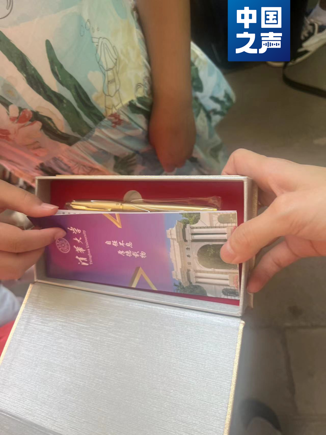 “演讲”过后,这位青年掏出了一本名为《清华北大状元篇》的小册子,以及一个附带清华、北大校徽的钢笔礼盒。他表示,这本书是他的学长学姐一起写成的,而钢笔礼盒是从清华校内文创店购买的,钢笔和书本售价一共是200元,可以成套购买、也可以单独购买。