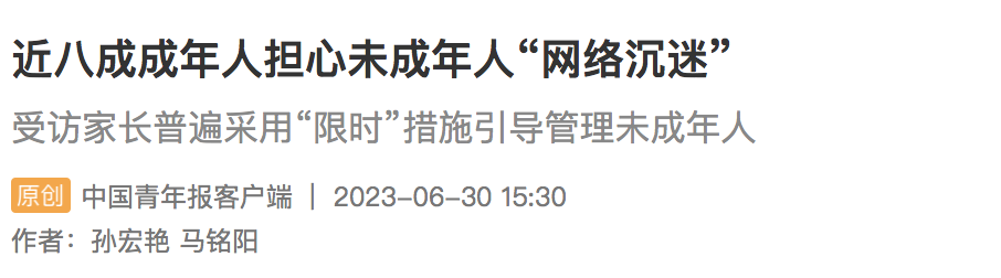 今年6月,《未成年人网络权益保护及安全感满意度调查报告》显示,近八成成年人担心未成年人“网络沉迷”。