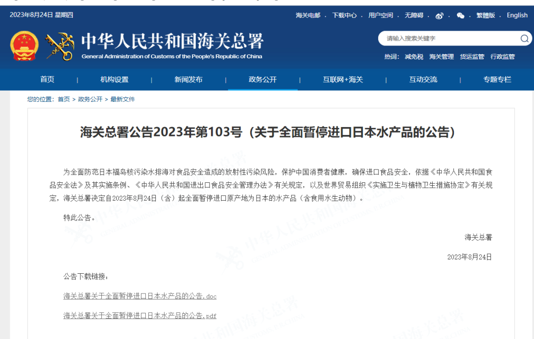 海关总署8月24日发布关于全面暂停进口日本水产品的公告。