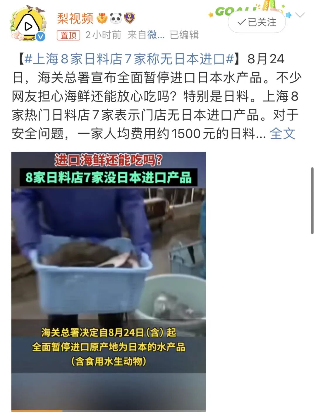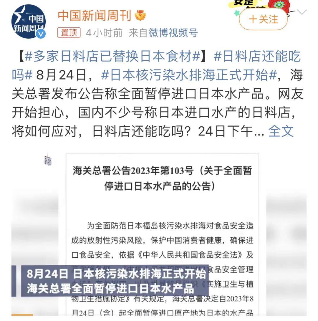 国内不少号称日本进口水产的日料店,将如何应对?网友开始担心,日料店还能吃吗?24日下午,@中国新闻周刊 致电北京多家人气日料店,其中一家表示有两款日本进口食材已暂停供应,其余店铺均表示此前已将食材替换为其他国家或国产海鲜产品。
