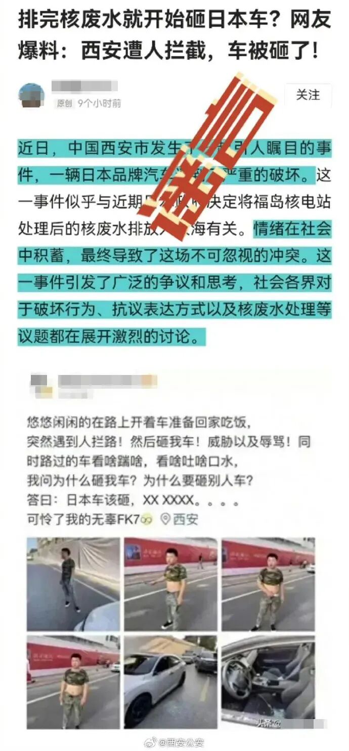 近日网传“排完核废水就开始砸日本车?网友爆料:西安遭人拦截,车被砸了”。