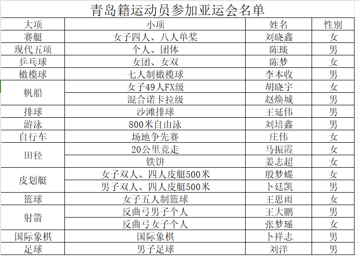 7、9月14日,观海新闻记者从青岛市体育局获悉,共有18名青岛籍运动员入选杭州亚运会中国体育代表团,他们将参加14个大项的角逐,参赛人数和项目均超越上届。