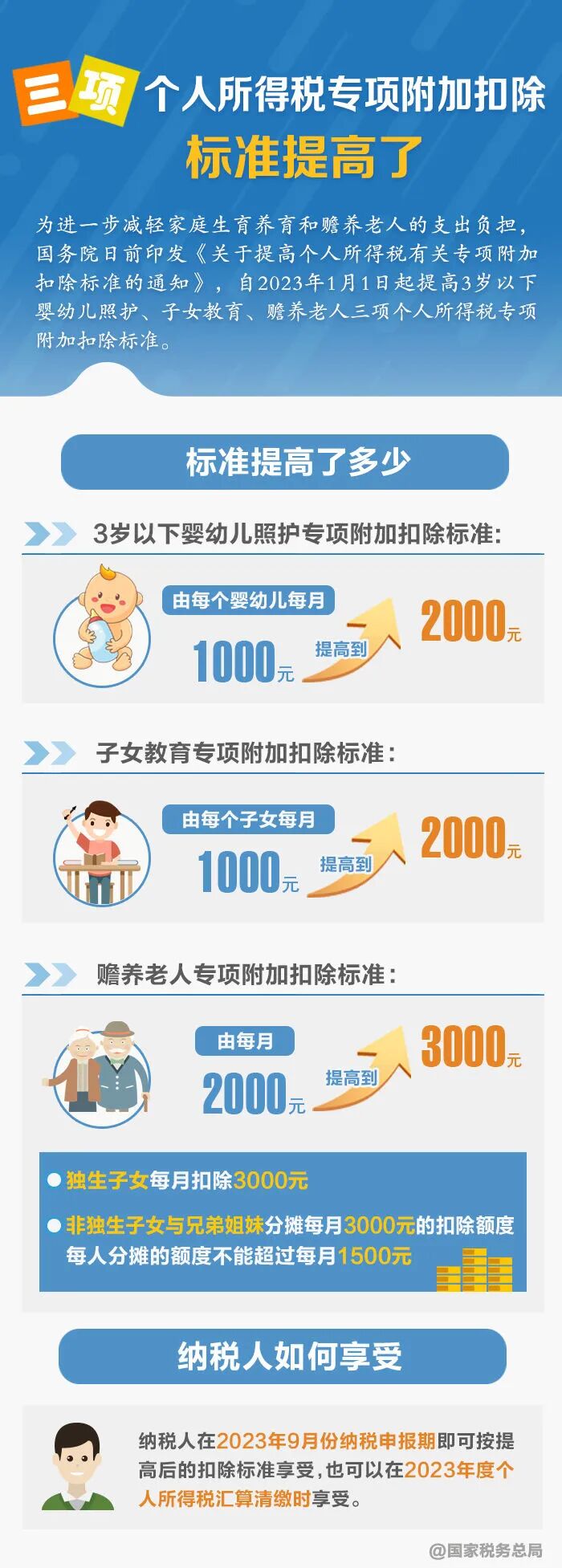 根据通知,自2023年1月1日起,3岁以下婴幼儿照护专项附加扣除标准,由每个婴幼儿每月1000元提高到2000元;子女教育专项附加扣除标准,由每个子女每月1000元提高到2000元。