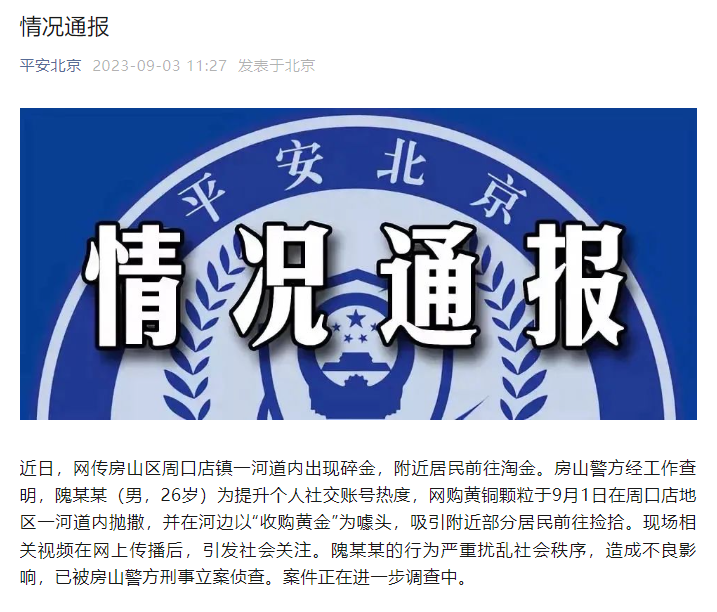 近日,网传房山区周口店镇一河道内出现碎金,附近居民前往淘金。房山警方经工作查明,隗某某(男,26岁)为提升个人社交账号热度,网购黄铜颗粒于9月1日在周口店地区一河道内抛撒,并在河边以“收购黄金”为噱头,吸引附近部分居民前往捡拾。现场相关视频在网上传播后,引发社会关注。隗某某的行为严重扰乱社会秩序,造成不良影响,已被房山警方刑事立案侦查。案件正在进一步调查中。