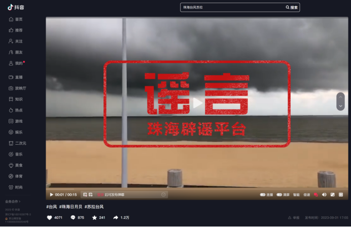 9月1日,一则“龙吸水”的视频在抖音平台流传,文字配有台风“苏拉”标签,视频显示拍摄地点位于珠海日月贝附近海域。