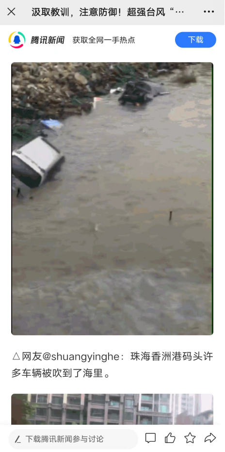 经珠海辟谣平台核查取证,该视频为不实信息,是嫁接台风“天鸽”期间香洲码头的旧视频。原文章如下图所示,发布时间为2017年8月23日。