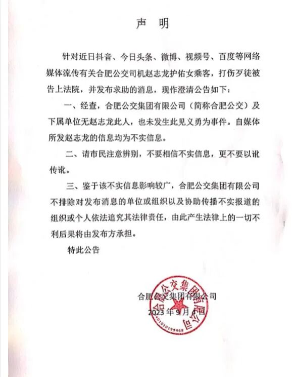 9月4日,合肥公交集团发布声明:针对近日抖音、今日头条、微博、视频号、百度等网络媒体流传有关“合肥公交司机赵志龙护佑女乘客,打伤歹徒被告上法院,并发布求助”的消息,经查,合肥公交集团有限公司及下属单位无赵志龙此人。