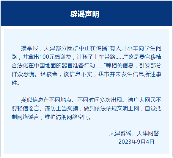 据“天津辟谣”微信公众号