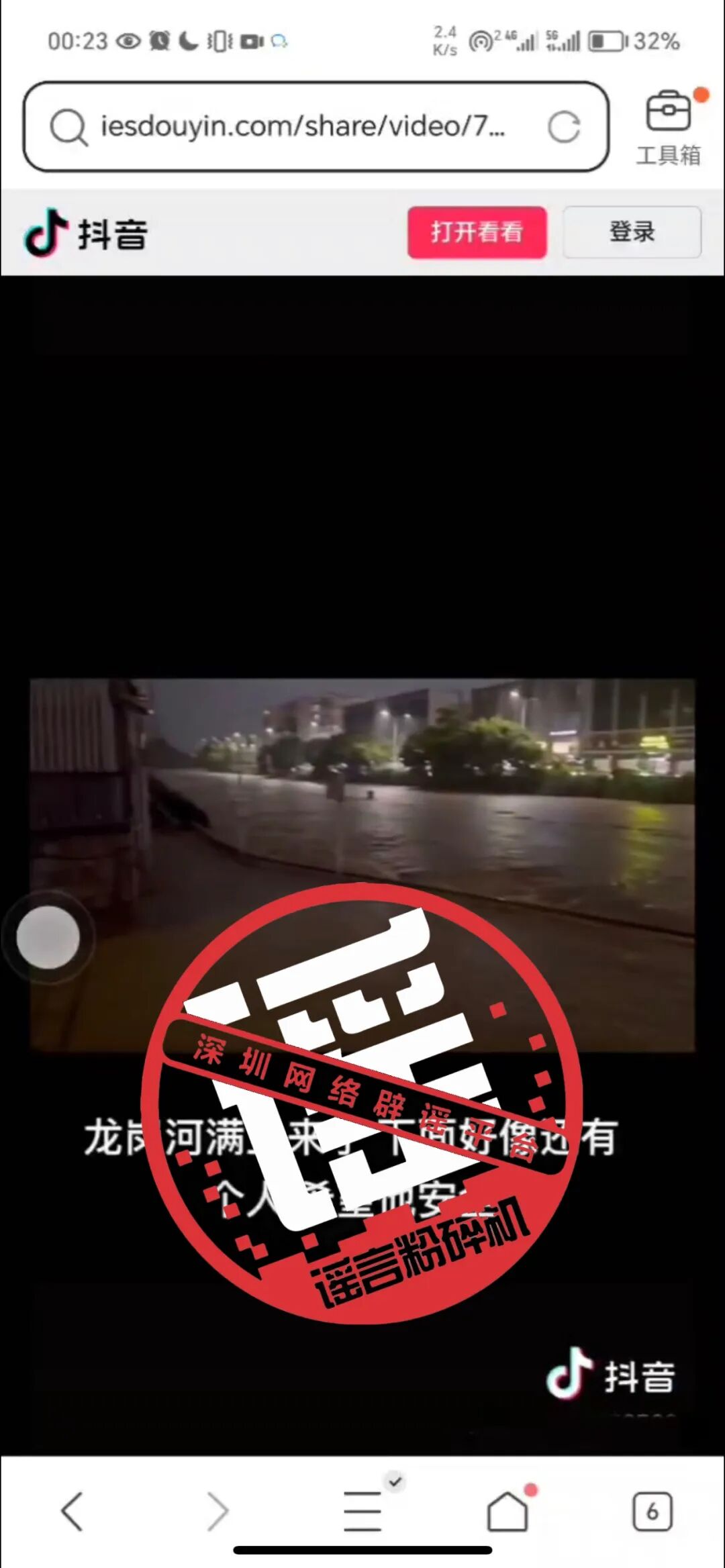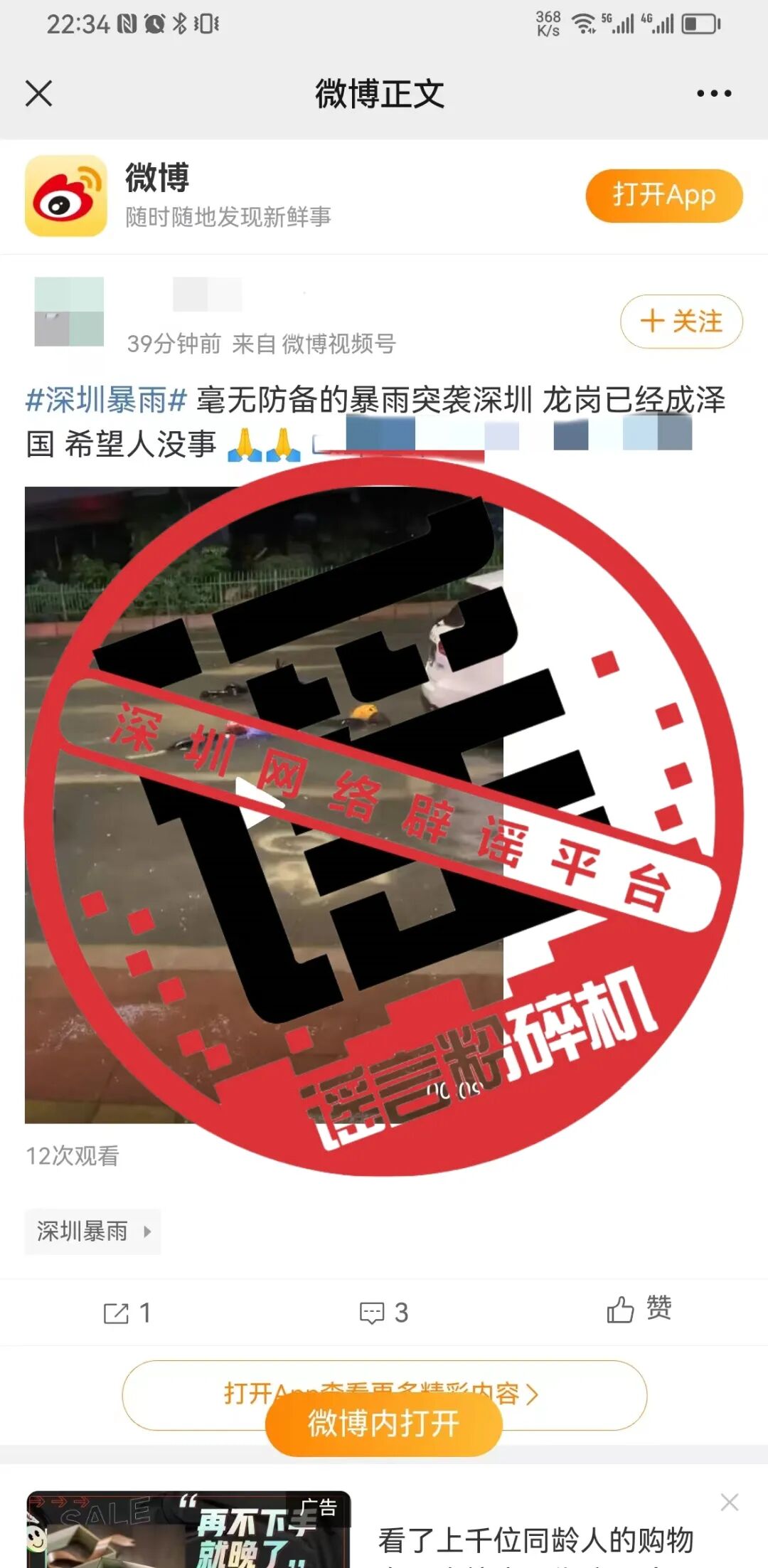 有网友在社交平台发布视频,称“深圳龙岗区龙河路373号附近疑似有人被冲进河流”,经深圳新闻网记者证实为谣言。经核实,“疑似落水的人”其实是河里自动监测仪器。