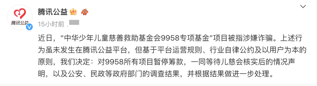 13日,@腾讯公益 和微博@微公益 相继发文称,对9958所有项目暂停筹款,等待调查结果↓↓