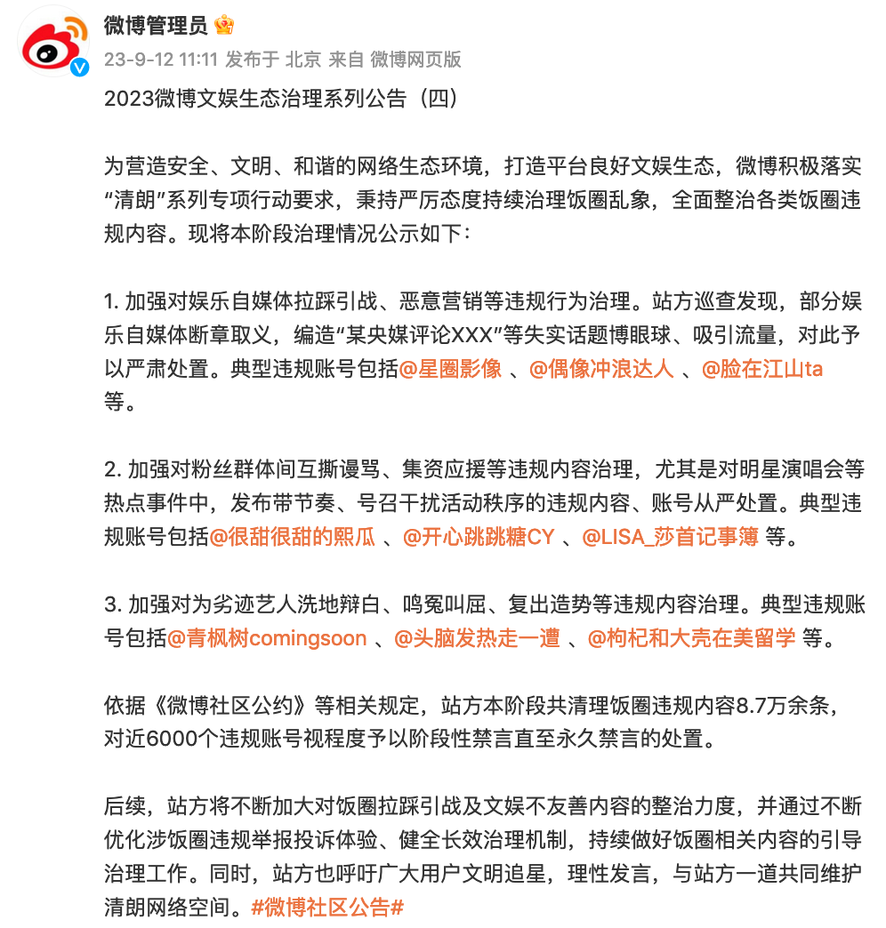 9月12日,新浪微博社区管理官方微博@微博管理员 发布文娱生态治理系列公告称,为营造安全、文明、和谐的网络生态环境,打造平台良好文娱生态,微博积极落实“清朗”系列专项行动要求,秉持严厉态度持续治理饭圈乱象,全面整治各类饭圈违规内容。