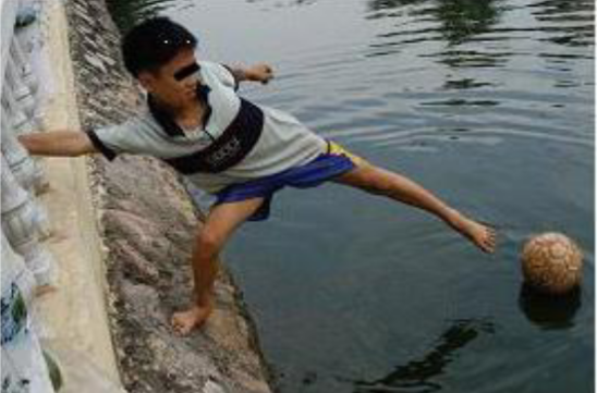 儿童在设法取回掉到水中的足球,图源:《儿童溺水干预技术指南》