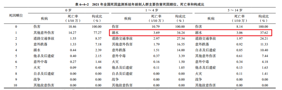 目前很多组织,包括世界卫生组织,中国国家疾控中心以及各级医院都有关于少年儿童意外伤害及死亡率的统计。尽管这些统计的对象和方法可能有些差别,但对1~14岁的少年儿童来说,溺水死亡所占的比例都会位居前二名。而根据我国2021年全国死因监测的数据,溺水是1~14岁少年儿童意外死亡的首要原因。