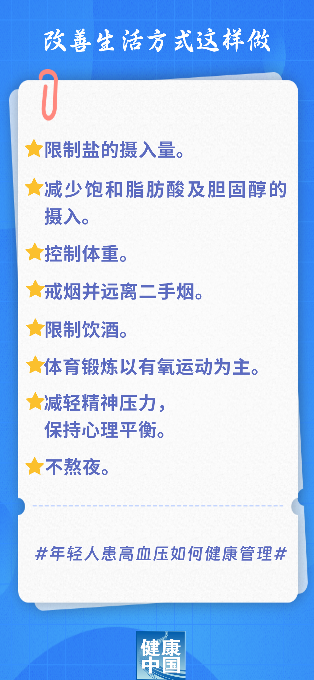国家卫生健康委员会郑重呼吁,年轻人要关心自己的身体健康,重视血压监测;养成良好的生活方式,管理好血压;遵医嘱服用药物,把血压控制在目标值以内,降低心脑血管疾病患病率,尽早迎来我国心脑血管疾病的防治拐点。