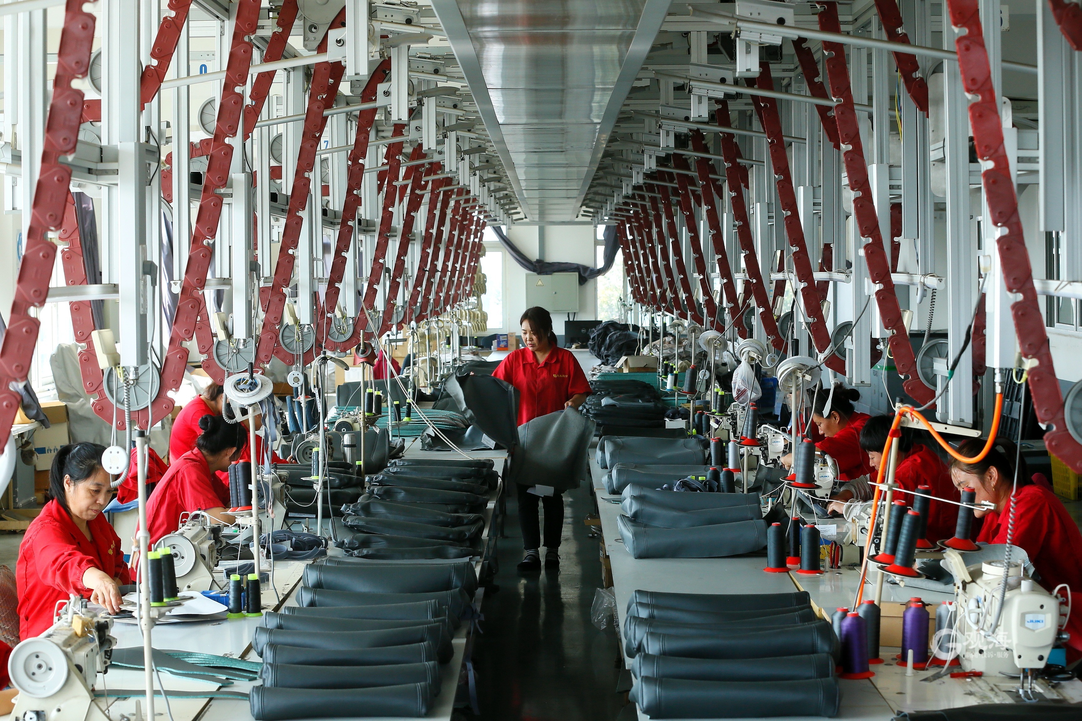 10月9日,青岛美莱轨道股份有限公司的工人在生产出口到海外市场的飞机用座椅套。