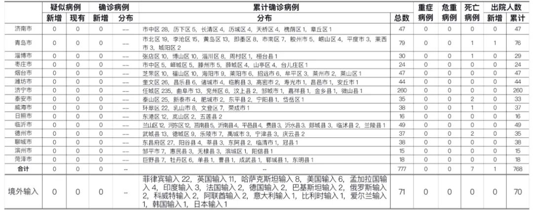 山东无新增本地疑似病例、确诊病例。累计报告确诊病例777例,死亡7例。新增治愈出院病例1例,累计治愈出院768例。