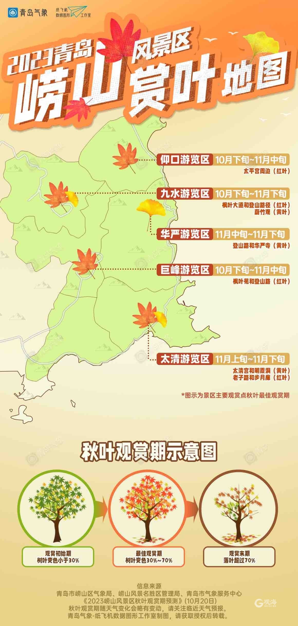 通常,崂山风景区的赏叶季会从10月份持续到12月初,由于山区的气温低于市区,赏叶时间不固定。为避免游客错过美景,记者从崂山气象部门获得消息,今年前期气温偏高,降水偏少,结合天气预报,预测今年秋叶最佳观赏时间比去年推迟10天左右,最佳赏叶期较去年偏短。崂山风景区全域五彩斑斓,均可观赏秋色,按照游览区汇总划分如下: