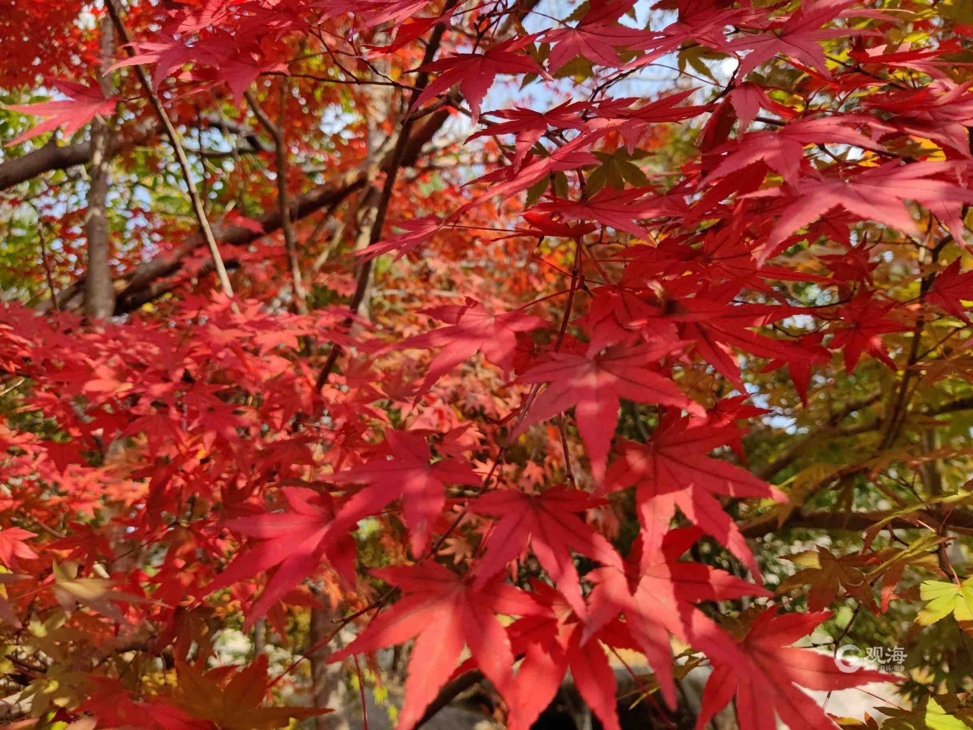 秋风翻涌,高天流云下,无际秋空碧透,纵横秋山青青,湛湛秋水蜿蜒。受地势和光照影响,枫叶变红存在时间差,因此会形成枫叶渐变的奇观,从绿色到黄色再到红色,彩虹般悬挂在山间,在阳光的映照下,显得愈发光彩夺目。景区相关负责人介绍,崂山风景区植被丰富,红叶树种繁多,在光照、地势的作用下,不同游览区的赏叶期亦有不同。