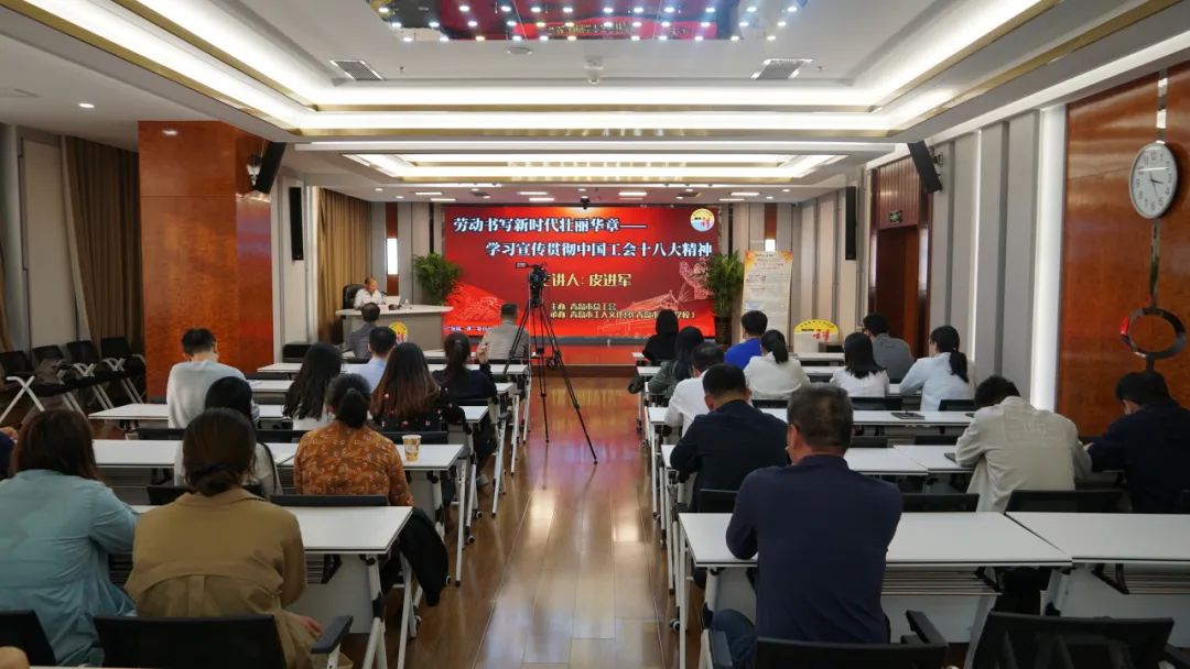 本次活动有幸邀请到中国工会第十八次全国代表大会代表、全国劳动模范皮进军作了题为《劳动书写新时代壮丽华章——学习宣传贯彻中国工会十八大精神》的宣讲。皮进军深情讲述了自己作为青岛一线劳模参加中国工会十八大盛会的光荣经历,完整准确传达了中国工会十八大精神,又结合自身作为一线产业工人爱岗敬业、勇于创新、甘于奉献的励志故事和奋斗经历,带着深厚的情谊同党员干部们深入学习宣传大会精神,皮进军的宣讲慷慨激昂又包含真挚深情,使党员干部们深受震撼、感动和鼓舞,赢得了阵阵热烈掌声。文化宫党总支书记、主任于常明在总结时强调,幸福是奋斗出来的,文化宫人要把学习贯彻中国工会十八大精神作为当前和今后一段时期的重要任务,从皮进军同志等劳动模范先进事迹中汲取奋斗力量,围绕中心、服务大局、卯足干劲、争创一流,以优异成绩迎接青岛市工代会胜利召开。