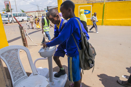 3月14日,在卢旺达首都基加利,儿童进入公交车站时洗手。新华社发