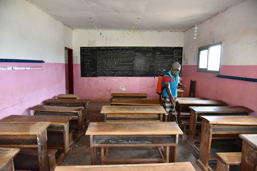 5月29日,一名教职工在喀麦隆首都雅温得即将复课学校内进行消杀作业。新华社发