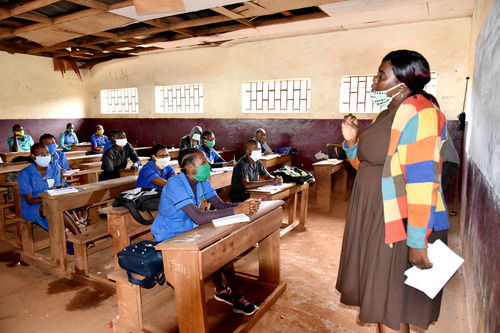 6月1日,在喀麦隆首都雅温得的一所学校,老师和学生在保持安全距离的情况下上课。新华社发